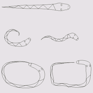 1. Вставьте в открытый документ CorelDRAW новую страницу и, пользуясь приемами построения линий, постройте в ее верхней части стилизованное изображение змеи (рис. 3.17, сверху). Вначале постройте замкнутую кривую, соответствующую абрису головы и тела змеи. В качестве глаз и ноздрей постройте небольшие эллипсы, а зигзагом на спине послужит ломаная линия, состоящая из прямолинейных сегментов. Если абрис получится кривоватым — не беда, в последующих уроках мы ознакомимся с приемами, позволяющими не только с идеальной точностью строить подобные изображения, но и корректировать их, а для этого упражнения высокая точность не нужна.