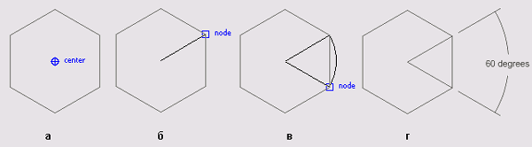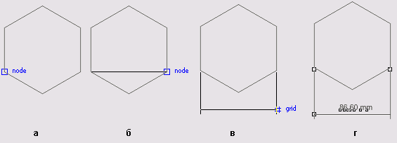 2. Выберите в наборе инструментов инструмент Dimension (Размерные линии) и на панели атрибутов щелкните на кнопке горизонтального размера. Начнем построение горизонтальной размерной схемы с задания управляющих параметров на панели атрибутов. Установите тип измерения Decimal (Десятичный), в качестве единиц измерения выберите миллиметры и запретите включение обозначения единиц в размерную надпись. Точность отображения выберите равной двум разрядам после запятой. Наведите указатель инструмента на левый нижний угол шестиугольника и, добившись, чтобы точка присоединения обозначилась цветными маркером и надписью node (рис. 3.23, а), щелкните кнопкой мыши.